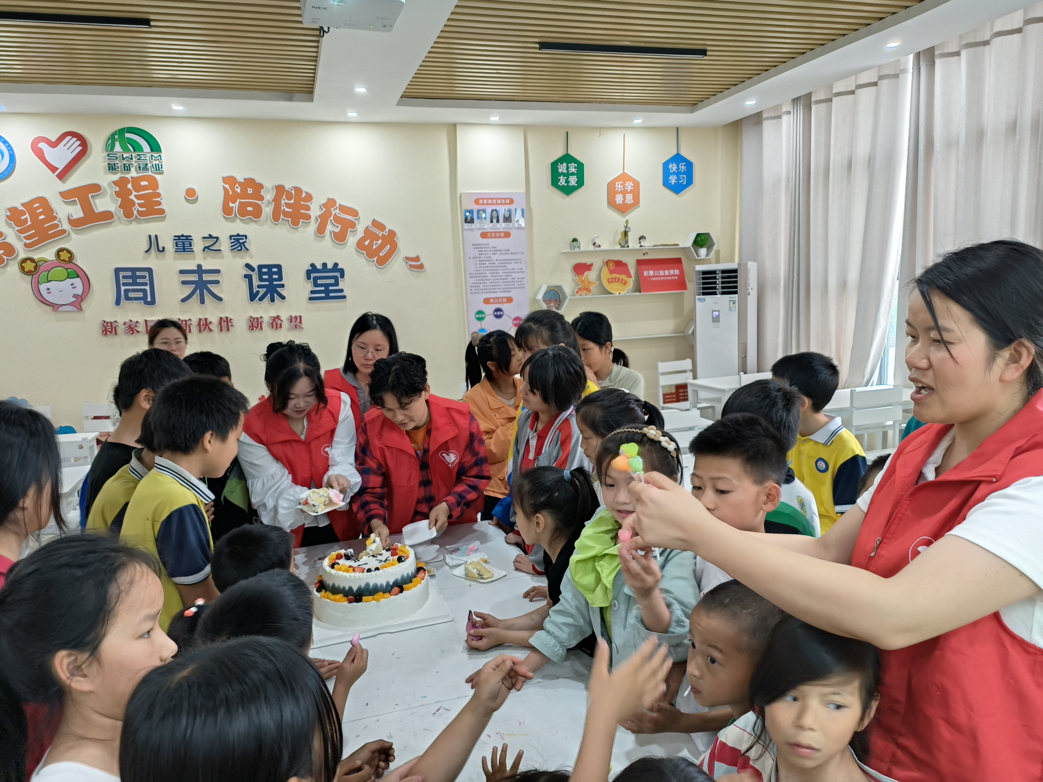 大龍開發(fā)區(qū)春暉家園內(nèi),一系列富有趣味性和互動性的活動陸續(xù)展開,能礦錳業(yè)工會團(tuán)委人員、青年志愿者和春暉家園的老師們一道與孩子們做起了“我的寶寶在哪里”“小腳踩大腳”“鋪地磚”等游戲,現(xiàn)場歡聲笑語不斷,氣氛熱烈而歡快。 游戲結(jié)束后,孩子們圍坐在一起,共同切蛋糕,共同品嘗甜蜜,孩子們臉上洋溢著幸福笑容,此刻的春暉家園溫馨而快樂,成為孩子們歡樂的港灣。